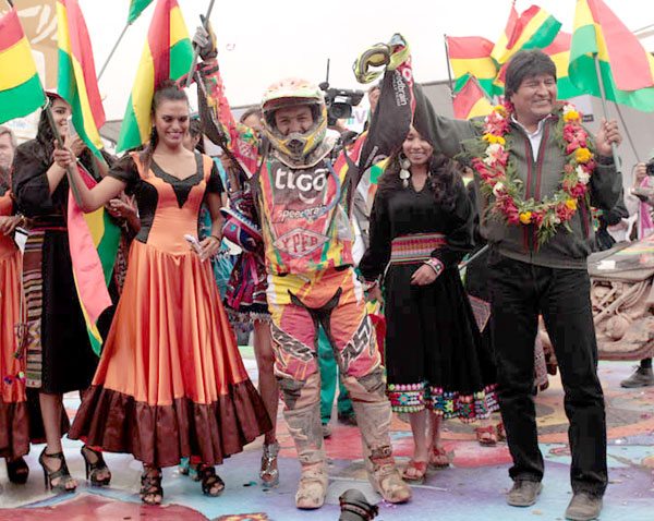 MORALES: Evo Morales, Presidente de Bolivia y precursor para que el magno certamen se corriese por territorio nacional, se encargó de recibir a Juan Carlos Salvatierra (motos) y Walter Nosiglia (cuadriciclos), en medio de una euforia y alegría del público. El Mandatario destacó el esfuerzo de los pilotos quienes, no pudieron contener su emoción, en especial, el piloto de Nosiglia