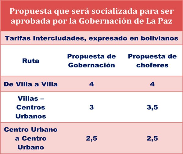 Las tres nuevas tarifas, de La Paz a El Alto y viceversa, basadas en una minuciosa estructura de costos, serán socializadas en los próximos días en ambos distritos, por la Federación de Juntas Vecinales de las ciudades. Mientras la Gobernación en los próximos días hará el anuncio oficial.