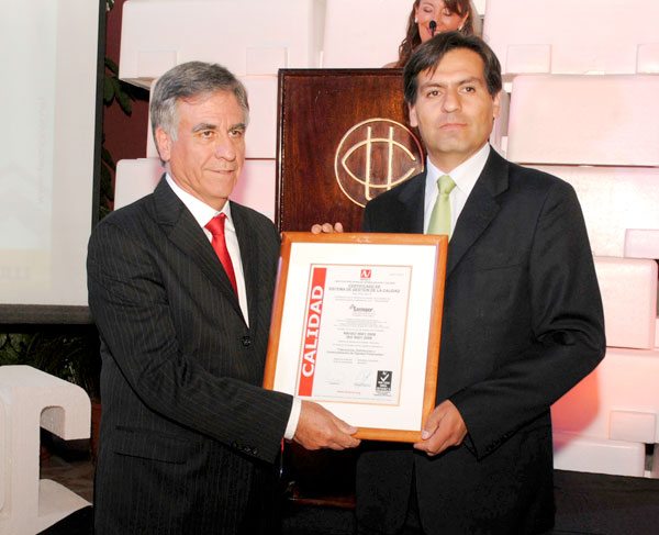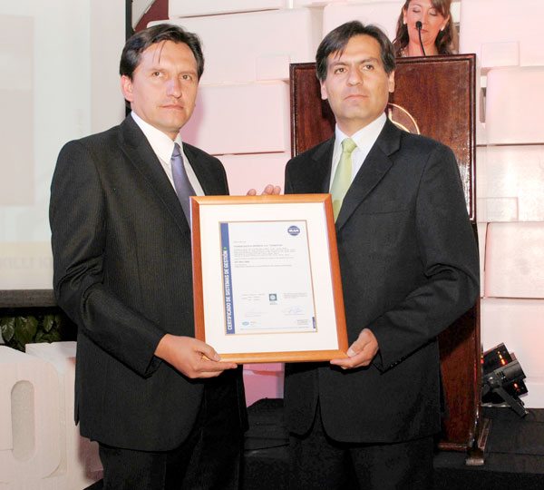 Junto al máximo ejecutivo de Tecnopor recibie-ron los certificados de calidad el gerente General Jorge Castro y Teddy Huayta, responsable del Sistema de Gestión de la Calidad (SGC), Tecnopor La Paz.