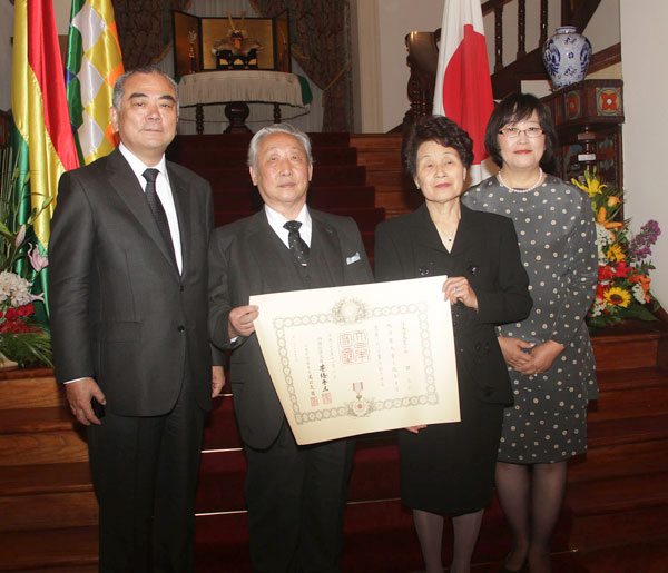 El Ministro de Asuntos Exteriores del Japón, a través del embajador acreditado en nuestro país, Hidehiro Tsubaki, otorgó la medalla Orden del Sol Naciente, Rayos de Oro y Plata al señor Shozo Nishi, y la Orden del Sol Naciente, Rayos de Oro al médico boliviano Raúl Beltrán Osio.