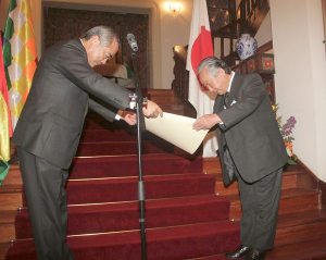 En el caso del señor Nishi, el Jefe de la misión japonesa dijo que desempeñó las funciones de Presidente de la Sociedad Japonesa de La Paz, además de ocupar importantes puestos como el de la Vicepresidencia de la Federación Nacional de Asociaciones Boliviano- Japonesas y la Vicepresidencia de la Cámara Oficial de Comercio e Industria Boliviano Japonesa, contribuyendo al intercambio entre naciones.