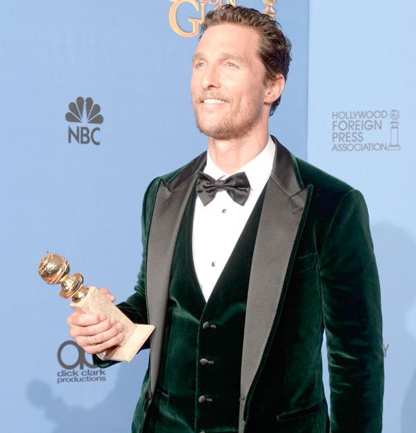 Matthew McConaughey se alzó con el premio a mejor actuación masculina en una película dramática, y lo hacía luciendo uno de los atuendos más destacados de la noche: un esmoquin tres piezas, con chaqueta y chaleco en terciopelo de color verde oscuro, firmado por Dolce & Gabbana, y que redondeaba con una pajarita negra de seda y barba recortada.
