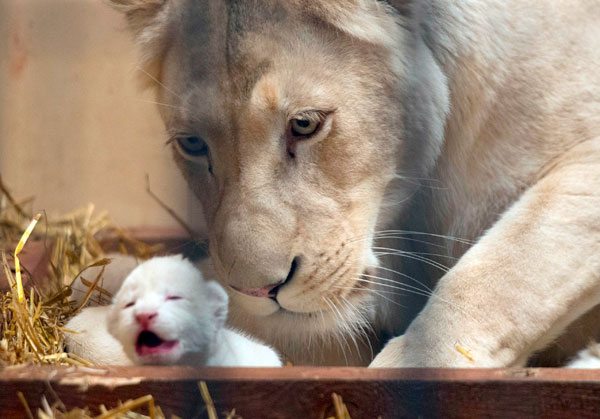 Polonia.- La leona Azira observa a sus cachorros en el zoo safari de Borysewo (Polonia). Azira y sus cachorros son leones blancos, una rara variante de la que existen unos pocos cientos de ejemplares en el mundo. Según lo que se cree, su genética ha estado siempre en la de los leones normales, pero debido a que es un gen recesivo, es muy raro que aparezca este tipo de leones y en estado salvaje no pueden sobrevivir mucho tiempo, ya que por su pelaje blanco, no tiene el camuflaje indicado que a los leones normales les permite cazar sin ningún tipo de problema.