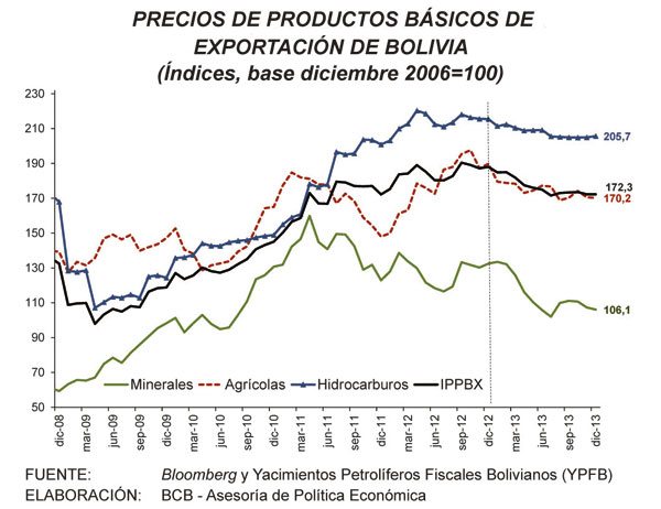 El Índice de Precios de Productos Básicos de Exportación de Bolivia (Ippbx) disminuyó sistemáticamente a lo largo de 2013, dando como resultado una caída acumulada de 8,4 por ciento, donde destacan los descensos en los precios de los minerales (19,9 por ciento), productos agrícolas (10,3 por ciento) e hidrocarburos (4,6 por ciento). El informe de Política Monetaria 2014 del Banco Central, dado a conocer ayer, explica que "la caída observada en los precios de los minerales se concentró principalmente en la primera mitad del año (20 por ciento), por el estancamiento de la demanda de importantes economías como China".