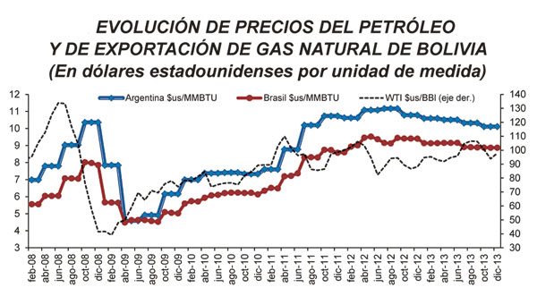 En cuanto a los precios de los cereales, su trayectoria se definió por las mejores cosechas de maíz, trigo y arroz. Los precios de gas natural, principal producto de exportación de Bolivia, mostraron una ligera tendencia a la baja en el primer semestre, comportamiento que luego se atenuó en los últimos meses. Estos precios están muy ligados a la tendencia del precio internacional del petróleo, ya que se determinan en base a las cotizaciones internacionales de una canasta de hidrocarburos (fuel oils) con un rezago de 3 meses para Brasil y 6 meses para la Argentina.