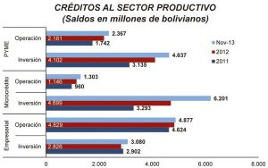 El crédito del sistema financiero al sector privado no financiero mantuvo el dinamismo que lo caracterizó durante los últimos años, alcanzando un saldo de Bs 85.395 millones al final de 2013, lo que representa un crecimiento de 18,6 por ciento. La expansión de Bs 13.420 millones es la más alta de la serie histórica y se produjo con incrementos importantes en los créditos concedidos al sector productivo.