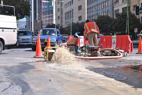 Una tubería de agua potable reventó ayer en la avenida Mariscal Santa Cruz, a la altura de la Caja Nacional de Salud (CNS), cabe recalcar que esta es la segunda fuga en menos de una semana que se presenta en el sector. Al momento del desperfecto, los funcionarios de Epsas señalaron que no sabían las causas del daño.