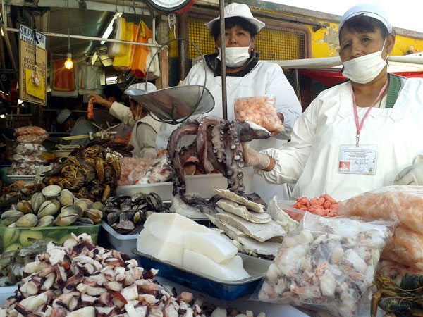 En su puesto de venta se puede apreciar variedad de langostinos, camarón, pulpo, calamar, surtido de mariscos, ostiones, cochayuyo, bacalao, camaroncillo, entre otros.