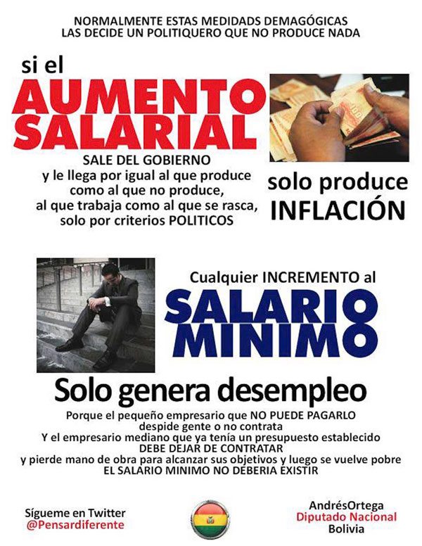 Andrés Ortega vía Facebook (Andrés Ortega T) se manifestó sobre el anuncio de incremento salarial bajo una crítica al modelo socialista. “Cualquier incremento del salario mínimo nacional oficial genera desempleo”, dijo el diputado opositor y compartió un gráfico para explicarlo.