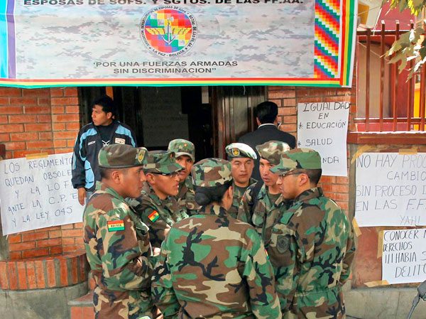 Por su lado en la ciudad de Santa Cruz, Liliana Surco, representante de las esposas de sargentos y suboficiales del Ejército en ese departamento, apeló a la sensibilidad al Alto Mando de las Fuerzas Armadas y Gobierno para dar curso a sus demandas de “descolonización” de las Fuerzas Armadas, porque los implicados pidieron radicalizar las medidas en las diferentes regiones, ya que el proyecto que presentó el sector movilizado no fue siquiera revisado, debido a que el ministro de Defensa, sostiene que no habrían respetado el conducto regular, y que por esa razón el documento no es tomado en cuenta.