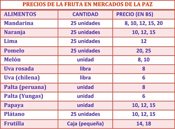 “Las frutas vienen de diferentes lugares, no solo de los valles, sino de otros países como Argentina, Chile y Perú. La naranja traen desde Cochabamba, de Beni y Luribay y cuando haga más frio empezará a escasear, porque la helada daña todas las frutas y el cliente no quiere así, les gusta más jugoso”, dijo la comerciante Máxima Conde.