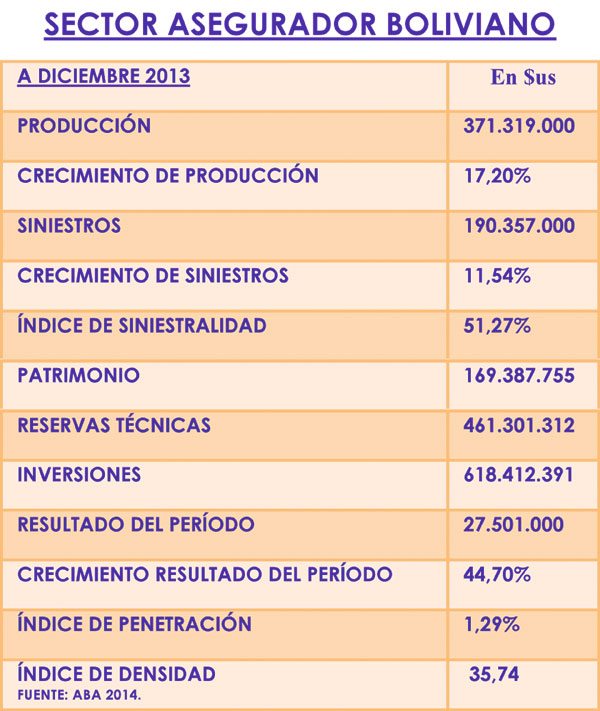 Luego de señalar estas cifras, la entidad concluyó que las actividades financieras del seguro en Bolivia crecieron de manera sostenida en la gestión pasada. A diciembre de 2013, el nivel de crecimiento fue de 17.20% (1.28% más que en 2012); su incidencia en el Producto Interno Bruto (PIB) fue del 1.29% y el nivel de la venta de primas (Producción Neta de Anulaciones PNA) fue de $us 371.319.000, según los registros difundidos por la Asociación Boliviana de Aseguradoras (ABA).
