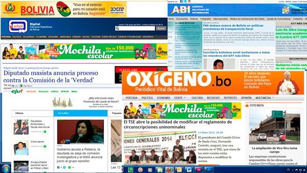 De los 70 medios analizados a escala nacional, el 77% fueron producidos en el eje troncal (La Paz con 27 diarios digitales, Santa Cruz con 16 y Cochabamba con 11) y el 23% en el resto del país. Por otro lado, el 80% de estos medios fueron publicados en ciudades capitales y el 20% en ciudades intermedias, señala un estudio de la Fundación UNIR, efectuado en 2013.