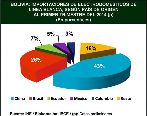 En el primer trimestre del 2014, el 96% de las importaciones de electrodomésticos de línea blanca llegaron al eje troncal de Bolivia, dirigiéndose un 64% hacia el departamento de Santa Cruz, 26% a La Paz y 6% a Cochabamba.