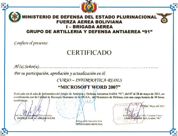 Los certificados vistos por este medio datan del año 2011 y corresponden a un curso organizado por la Fuerza Aérea Boliviana (FAB). La capacitación supuestamente se realizó del 7 al 28 de mayo de ese año en el aula de Informática del Grupo de Artillería y Defensa Antiaérea GADA “91”.