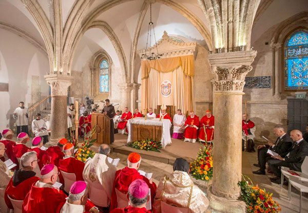 “En el Cenáculo, Jesús resucitado, enviado por el Padre, comunicó su mismo Espíritu a los Apóstoles y con esta fuerza los envió a renovar la faz de la Tierra”, afirmó en una homilía ante personas de su séquito y líderes eclesiásticos de Tierra Santa, en su mayoría obispos y patriarcas de varios ritos.