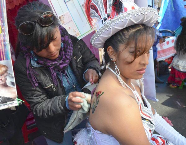 Otro de los servicios que tuvo bastante éxito fue el de tatuajes temporales, en blanco y negro o a colores, que fue muy requerido por las chinas de las diferentes morenadas, quienes buscaban lucir figuras parecidas a los bordados de sus trajes, en la espalda o los brazos.