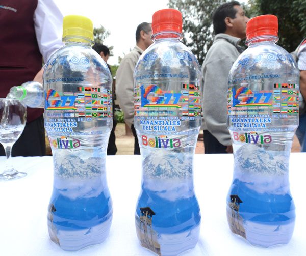 El agua mineral embotellada de los manantiales bolivianos del Silala, en la frontera con Chile, conmemora la Cumbre del G77 + China que reúne en Santa Cruz, unos 900 kilómetros al este de La Paz a las delegaciones de 133 países.
