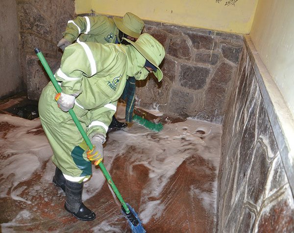 La jornada se inició desde las 7.00 de la mañana del pasado sábado, cuando personal de Emalt y Trebol, con escobas plásticas en mano y la ayuda de dos cisternas, lavaron y fumigaron varios pabellones, donde duermen los conscriptos que prestan su servicio militar en la urbe alteña.