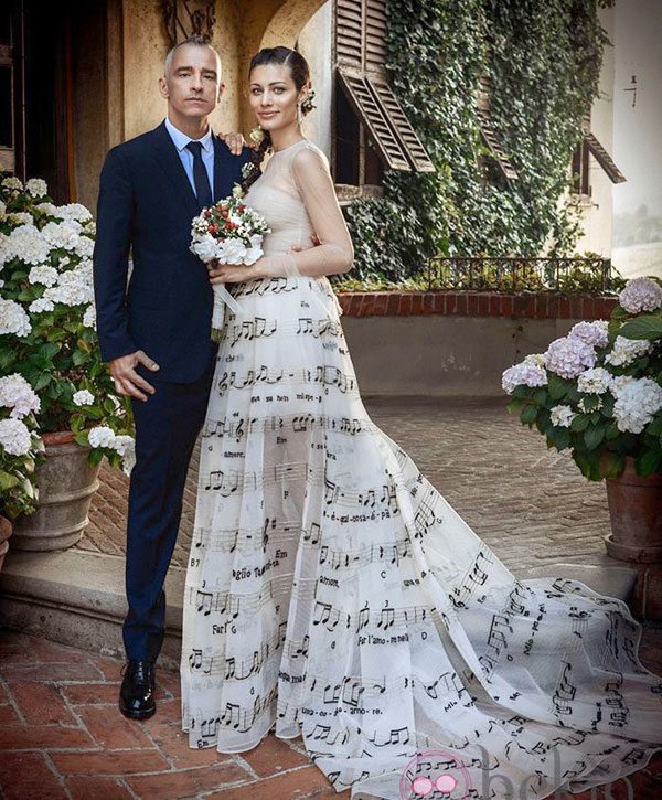 Ambos quisieron compartir este día tan especial con sus seguidores en las redes sociales. Para ello colgaron dos instantáneas en las que se ve a la pareja posar frente a una casa señorial y en un entorno campestre. En una de ellas, Ramazzotti besa con ternura en la mejilla a su nueva esposa. Cabe destacar el original vestido que llevaba la novia, nada más y nada menos que un “musical” vestido firmado por Valentino con un cuerpo de manga larga transparente y una falda decorada con notas musicales, un bonito homenaje a la profesión de su marido. Además, no son notas musicales cualquiera, sino la partitura del tema ‘Due Mondi’ de Lucio Battisti.