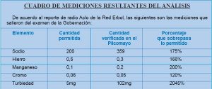 Un examen de laboratorio realizado por la Gobernación de Chuquisaca halló exceso de sodio, hierro, manganeso y cromo en las aguas del río Pilcomayo, que fueron afectadas por el colapso del dique de colas de la empresa minera Santiago Apóstol de Potosí, informó ayer el secretario general del gobierno departamental, Eber Almendras.