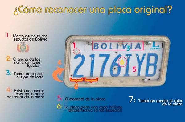 Marca de agua, el ancho de los números, el tipo de letras, el material utilizado para su fabricación, cinta brillosa retroreflectiva y la marca láser son los seis principales elementos de seguridad que se encuentran incorporados en las placas originales de todos los vehículos que circulan en Bolivia.