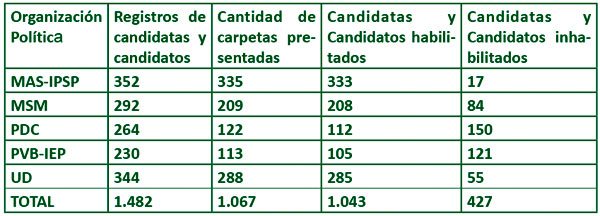 En observancia del artículo 105 de la Ley Nº 026 del Régimen Electoral, la Secretaría de Cámara del Tribunal Supremo Electoral verificó el cumplimiento de requisitos y las causales de inelegibilidad establecidos por ley de las y los candidatos.