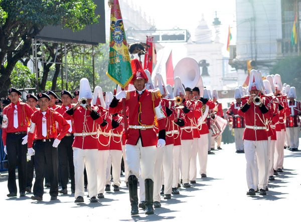 Las bandas de guerra de los estudiantes fueron el plus de la jornada, pues sus marchas, tonadas junto al replique de tambores y bombos, hicieron marchar a los estudiantes que junto a sus docentes conmemoraban a Bolivia.