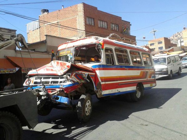 De acuerdo con la versión de los testigos en la ciudad de La Paz, el microbús de color rojo descendía por la principal avenida, momento en que llega a impactarse primero en la parte posterior de un minibús para luego efectuar un choque frontal en contra del mercado, dejando como saldo una persona fallecida aún no identificada, la cual fue remitida a la morgue del Hospital de Clínicas.