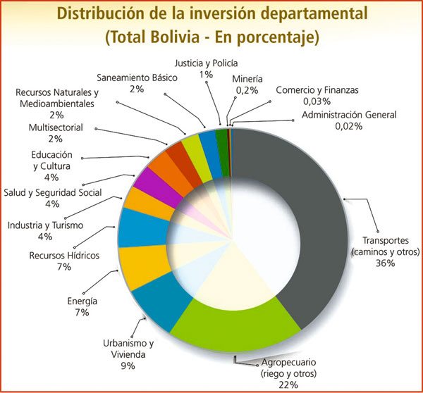 Este año suman 2214 proyectos para los nueve departamentos. Respecto al destino de la inversión, la prioridad, como en años anteriores, es el sector transportes, que es principalmente caminos, al que se destina 37% de la inversión departamental. La inversión en el sector agropecuario se ha incrementado en cierta medida en los últimos años llegando a 22% en 2014. Urbanismo y vivienda reciben 9% y energía 7%, que es básicamente electrificación rural. El sector de industria y turismo también registra un incremento en la asignación de recursos, sin embargo, recibe solamente 4% de inversión departamental.