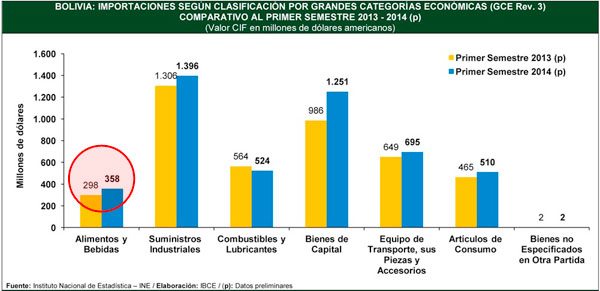 Según uno de sus últimos reportes del Instituto Boliviano de Comercio Exterior (IBCE) señaló que el valor alcanzado en el primer semestre de 2014 frente a similar período del año pasado fue 20 por ciento superior. En el período, la importación de alimentos se situó en $us 358 millones, frente a $us 298 millones del semestre anterior. A fines del 2013, la entidad privada señala que Bolivia es deficitaria en la producción de alimentos y que el Estado compra 300 productos de la canasta familiar de alimentos de países vecinos. Entre ellos están la manzana, arroz, pescado, yuca, almidón de maíz, leche evaporada, frutas frescas, almendras con cáscara, peras, kiwi, tomates, lenteja, entre otros.