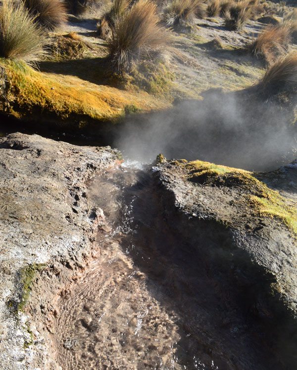 Agrega que en el sector, la tierra se prepara para recibir a otros géiser, minando el lugar y de repente aparecen. Nos dimos cuenta y escuchamos en la tierra el ruido que provocan cuando están por salir a la superficie, desgastan la roca, ya que esta región del Sajama es roca de altura; primero comienza con una poza y van evolucionando de a poco. Estos géiser tienen actividad durante todo el año y no cesan.