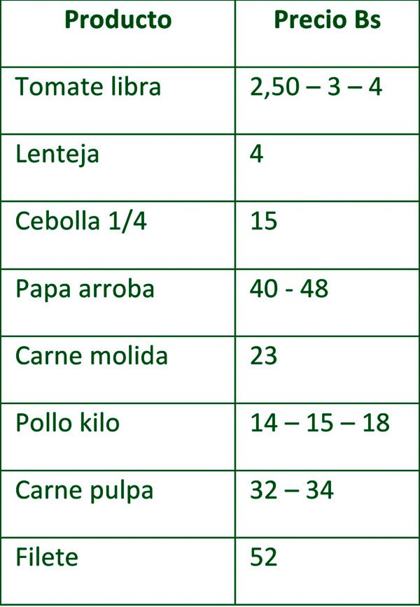 “En el pollo sí hay un incremento está Bs 18, antes estaba Bs 15,50. Las verduras están manteniendo su precio. La papa está Bs 48 ha subido de Bs 40, 44. A veces las mismas vendedoras aumentan, pero esto afecta principalmente al bolsillo de cada familia porque una persona ya tiene su presupuesto para todo el mes, entonces en vez de comer cuatro semanas ya comerán tres semanas, ya no alcanza el dinero”, dijo una de las amas de casa, María Eugenia Maldonado.