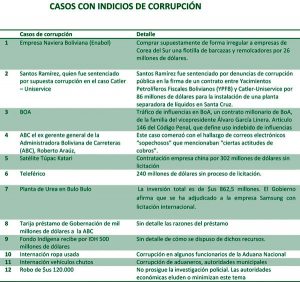 No están pendientes solo los hechos de corrupción del ámbito económico que fueron denunciados como escándalo en los medios como en caso del expresidente de YPFB, Santos Ramírez, sino otros como el caso de la compra de barcazas chinas, el caso BoA, el robo de dinero del BCB y la administración de la empresa naviera boliviana. En muchos de ellos falta transparencia del Gobierno que no explica las millonarias contrataciones de proyectos petroleros y obras civiles.