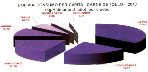 El consumo per cápita en las ciudades de La Paz y El Alto llegó el año pasado a 62.48 kilos de pollo, señala la Asociación de Avicultores de Cochabamba. Semanalmente llegan a ambas ciudades 1.6 millones de unidades de 2.10 kilos en promedio desde la ciudad del valle. Estas cifras no toman en cuenta a proveedores de Santa Cruz.