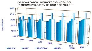 A nivel de países limítrofes, Brasil registra un consumo por persona al año de 48 kilos, por debajo de La Paz y El Alto que consumen 62 kilos. En promedio Bolivia registra una tasa de consumo de 34.91 kilos por persona,, Chile 37 kilos, Argentina 38 kilos y Perú, 39 kilos.