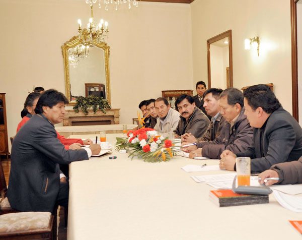 El presidente Evo Morales en reunión con los dirigentes de la Confederación de Maestros Urbanos de Bolivia acordaron conformar comisiones para evaluar el pliego petitorio de ese sector y ver si se puede dar vialidad a las demandas del sector.