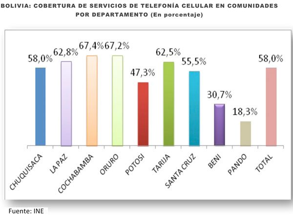 El INE señala también que el 58% de las comunidades agropecuarias tiene cobertura de telefonía celular: “Los mayores porcentajes se observan en Oruro y Cochabamba (algo más del 67%) y los menores en Pando (18,3%) y Beni (30,7%)”.
