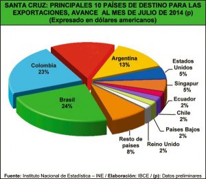 Al mes de julio de 2014, Santa Cruz representó el 74 por ciento del total de las exportaciones bolivianas de alimentos. Al mes de julio de 2014, los principales productos exportados desde Santa Cruz fueron: gas natural que representó el 36 por ciento del total exportado, torta de soya (20 por ciento), aceites crudos de petróleo (10 por ciento), aceite de soya en bruto (8 por ciento) y grano de soya (4 por ciento). En el período enero-julio de 2014, los principales países de destino para las exportaciones cruceñas fueron: Brasil con 468 millones de dólares, Colombia (440 millones), Perú (279 millones), Argentina (251 millones) y Estados Unidos (100 millones).