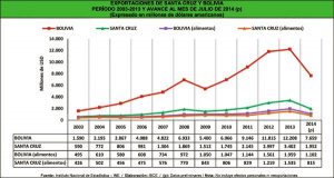 En el período 2003-2013, las exportaciones cruceñas sumaron $us 18.124 millones, registrando un crecimiento de 476 por ciento en dicho período. Representan, al mes de julio de 2014, el 25 por ciento del total exportado por Bolivia. Por su parte, las exportaciones de alimentos del departamento de Santa Cruz han resultado preponderantes en los últimos 11 años para el país, alcanzando su pico máximo el año 2013 con 1.535 millones de dólares, según el Instituto Boliviano de Comercio Exterior (IBCE).