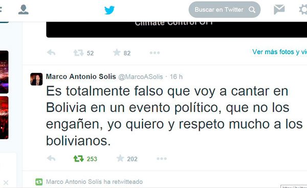“Es totalmente falso que voy a cantar en Bolivia en un evento político, que no los engañen, yo quiero y respeto mucho a los bolivianos”, publicó Solís la madrugada de ayer en su cuenta oficial de Twitter.