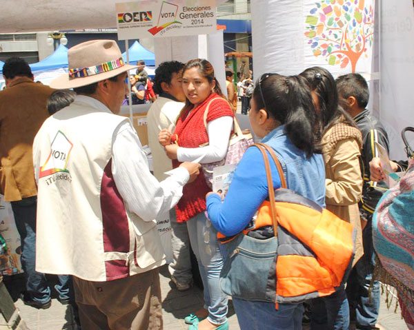A días de las elecciones, ciudadanos se acercan a los puntos de información del Tribunal Supremo Electoral (TSE), para verificar si fueron nombrados como jurados electorales para los comicios del 12 de octubre de 2014. El técnico del Servicio Intercultural de Fortalecimiento Democrático (Sifde), Pelagio Pati, señaló que en un lapso de tres horas, los puntos habilitados en la feria dominical del Prado atendieron cerca de 200 consultas.