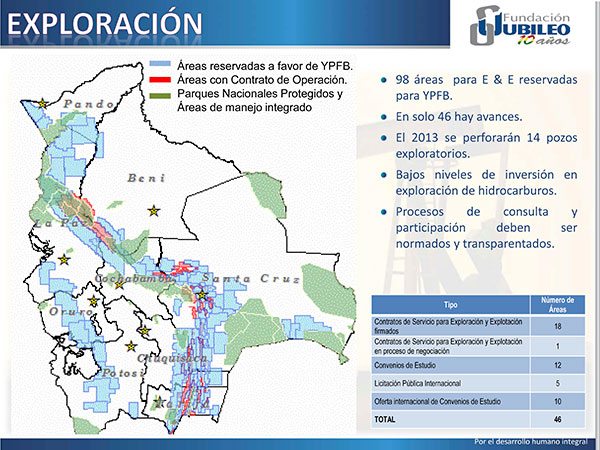 Las áreas para exploración y explotación reservadas para YPFB son 98. En solo 46 hay avances, dice la Fundación Jubileo. El 2013 se perforarán 14 pozos exploratorios y añade que existen bajos niveles de inversión en exploración de hidrocarburos. YPFB estimó en $us 3.029 millones el presupuesto para exploración y desarrollo este año.