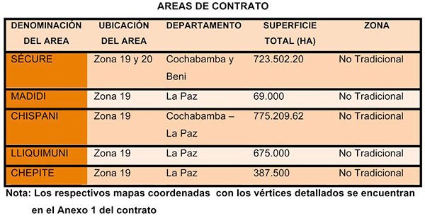 YPFB Petroandina, una compañía constituida entre YPFB (60%) y la venezolana PDVSA (40%), es la encargada del proyecto en ese bloque en el que tiene una concesión de 3,2 millones de hectáreas para tareas de exploración, que abarca los municipios de Guanay, Apolo, Teoponte, Caranavi, Palos Blancos, Asunta y San Borja.