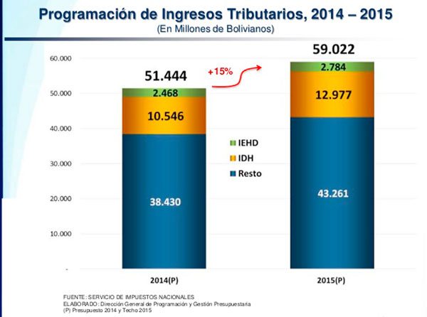 Explicó que en el PGE 2015 se calculó un promedio de Sus 80/Barril y, por tanto, no tendría efectos importantes. Sin embargo, el economista y exministro de Hidrocarburos, Mauricio Medinaceli, observó que el Gobierno maneja dos provisiones de precios del petróleo para el 2015. Por un lado, Villegas maneja un promedio de $us 70/Barril WTI (West Texas Intermediate, un tipo petróleo catalogado como dulce y liviano), pero el PGE 2015 indica $us 80,3/Barril WTI.