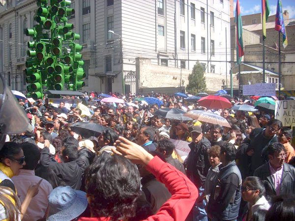 La jornada de ayer se caracterizó por la manifestación de funcionarios municipales en contra del Alcalde actual. “No lo dejan hacer gestión y eso recae en el principio de autoridad. Si nuestras autoridades no hacen cumplir lo que dice la Ley estamos perjudicándonos todos los paceños”, dijo uno de los entrevistados.