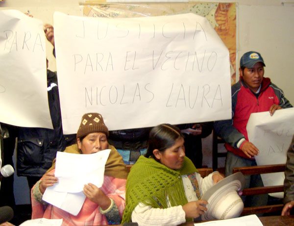 “Nosotros estábamos intentando defendernos, pero en ese momento llegó un grupo de policías que nos han comenzado a gasificar, actitud que fue aprovechado por nuestros agresores, quienes comenzaron a golpearnos con palos, picotas y piedras, en el cual la peor parte llevó nuestro vecinos Nicolás Laura, quién murió en el acto por que recibió varios golpes de picota en la cabeza”, manifestó la testigo.