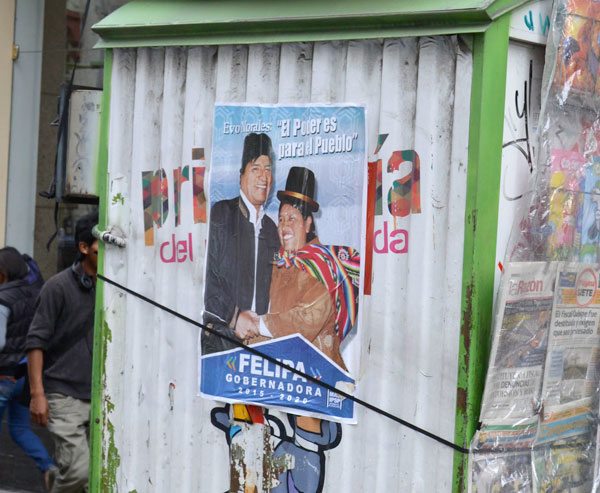 Los encargados de la campaña preelectoral de la candidata a la Gobernación de La Paz por el Movimiento al Socialismo (MAS), Felipa Huanca, están empapelando el centro paceño con afiches donde se ve a la postulante indígena acompañada del presidente Evo Morales.