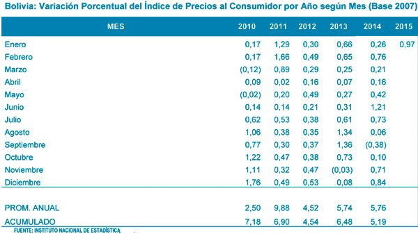 Entretanto, Cochabamba fue la más inflacionaria en enero de 2015. Como se recordará, el Índice de Precios al Consumidor fue de 0,97 por ciento, dato mayor de los últimos tres años. La explicación del dato se debería al cambio de nuevas autoridades y a la demanda de algunos productos, como el pollo, la papa, el tomate, entre otros.