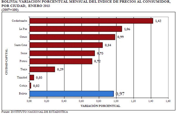 Asimismo, las ciudades más inflacionarias en enero de la presente gestión fueron Cochabamba 1,42%; La Paz 1,06%; Oruro 0,99%; Santa Cruz 0,84%; Sucre 0,75%; Potosí 0,72%; Tarija 0,29%; Trinidad 0,05% y Cobija 0,02%.